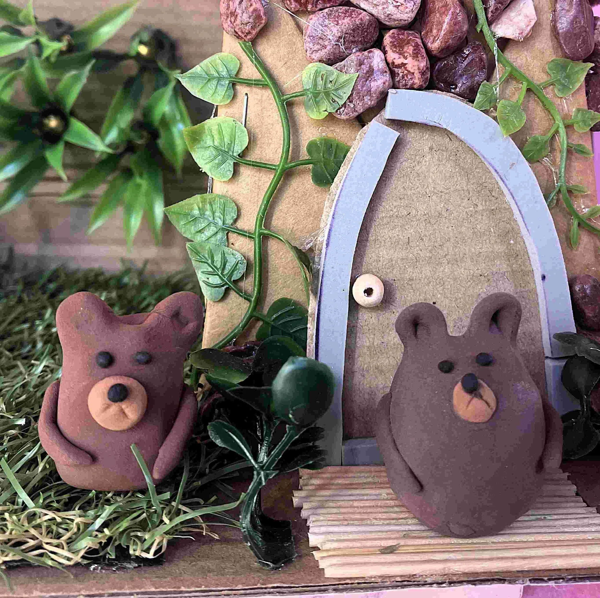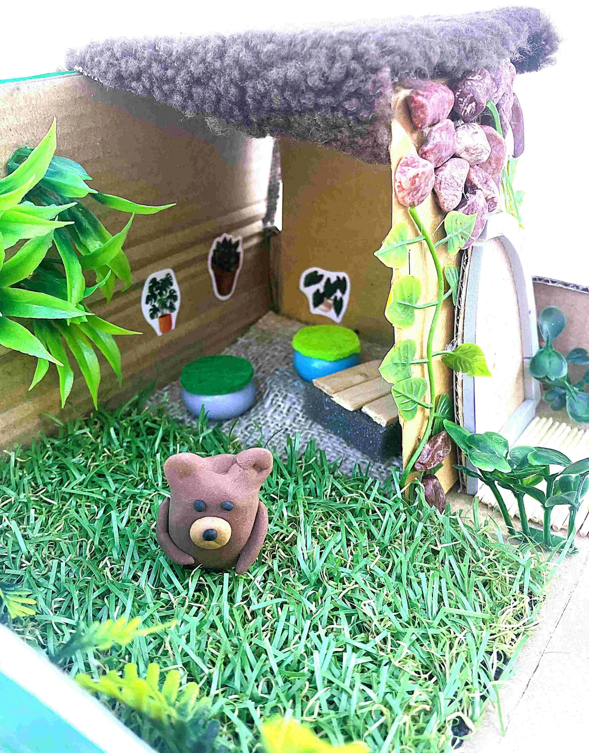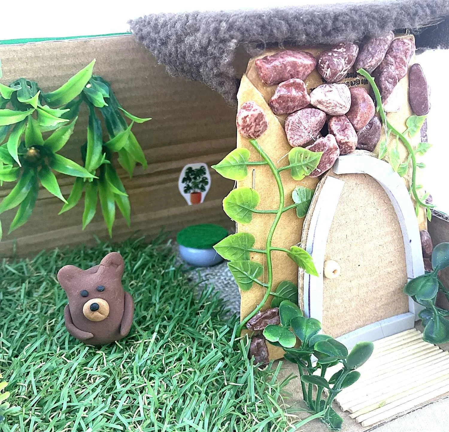 Create a miniature woodland scene and home for a delightful brown bear. Building a forest with trees, plants and grass then creating a cozy cabin for a bear to live. Cabin creation includes; door, window, climbing ivy, wood and stone panels and mossy roof with table and chairs on the inside. Kids will enjoy this miniature creative activity.