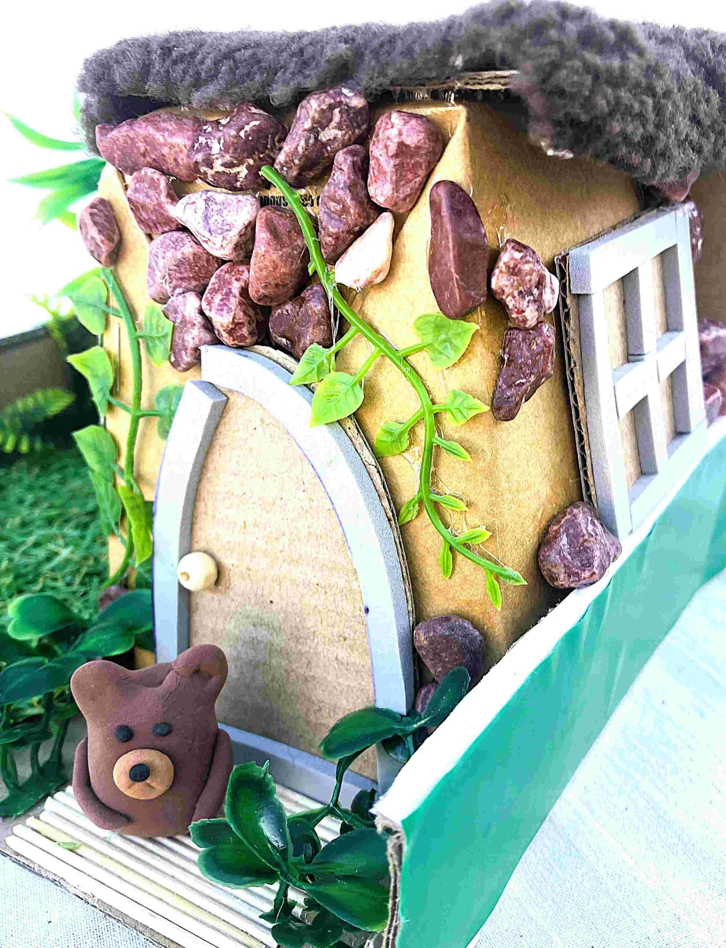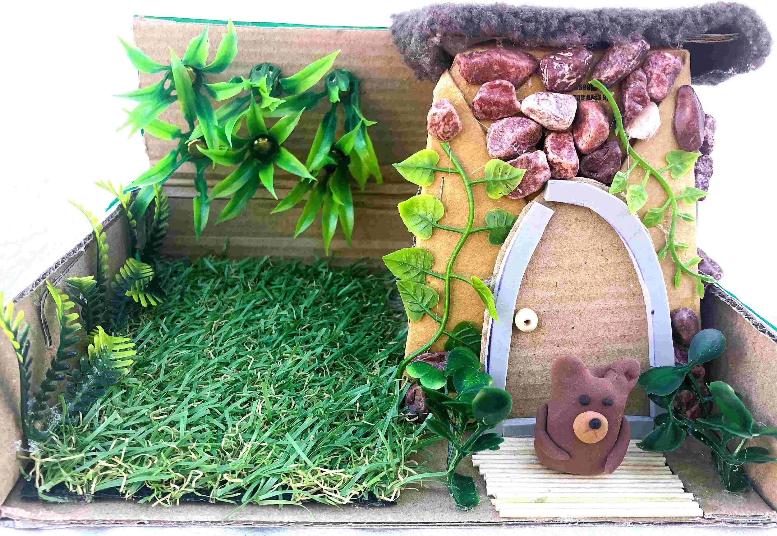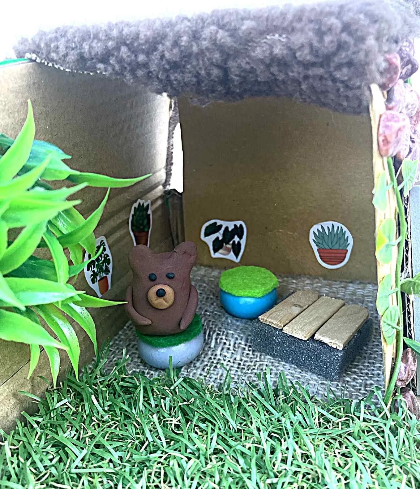 Create a miniature woodland scene and home for a delightful brown bear. Building a forest with trees, plants and grass then creating a cozy cabin for a bear to live. Cabin creation includes; door, window, climbing ivy, wood and stone panels and mossy roof with table and chairs on the inside. Kids will enjoy this miniature creative activity.