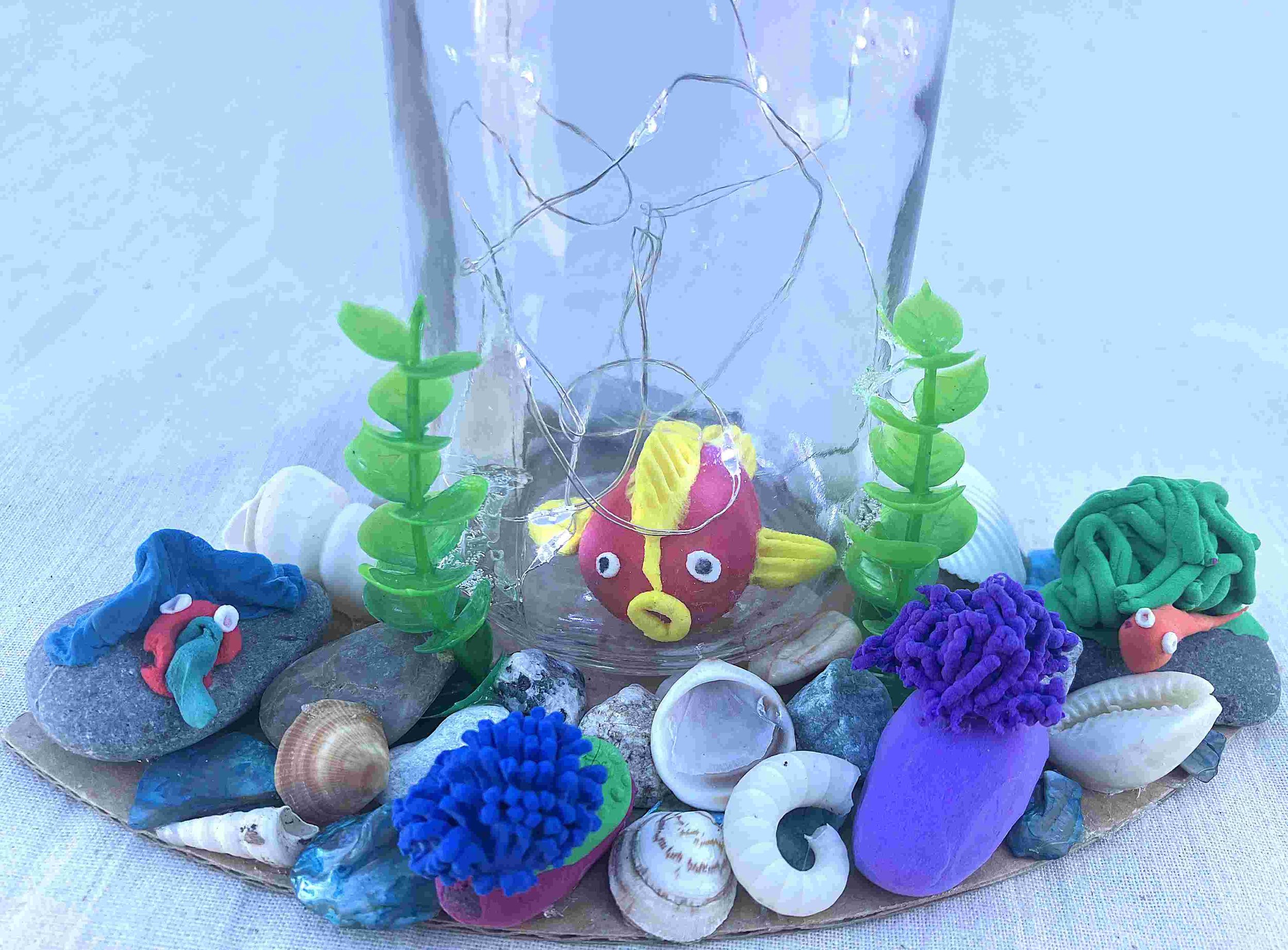 Create an underwater scene using beach shells, stones and colourful sea creatures. A string of LED lights bring this beautiful ocean bottle to life.