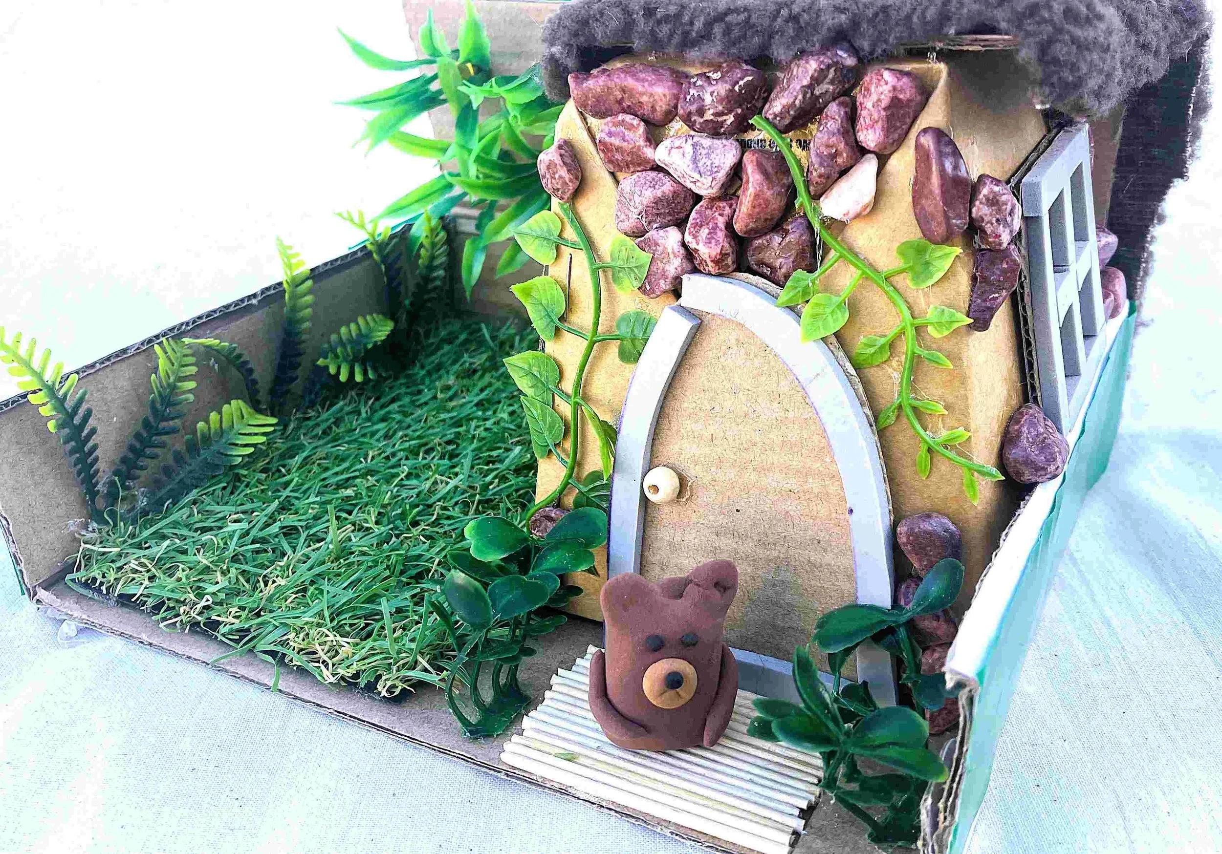 Create a miniature woodland scene for a delightful brown bear. Designing a forest, garden and cozy cabin for a bear to live in.