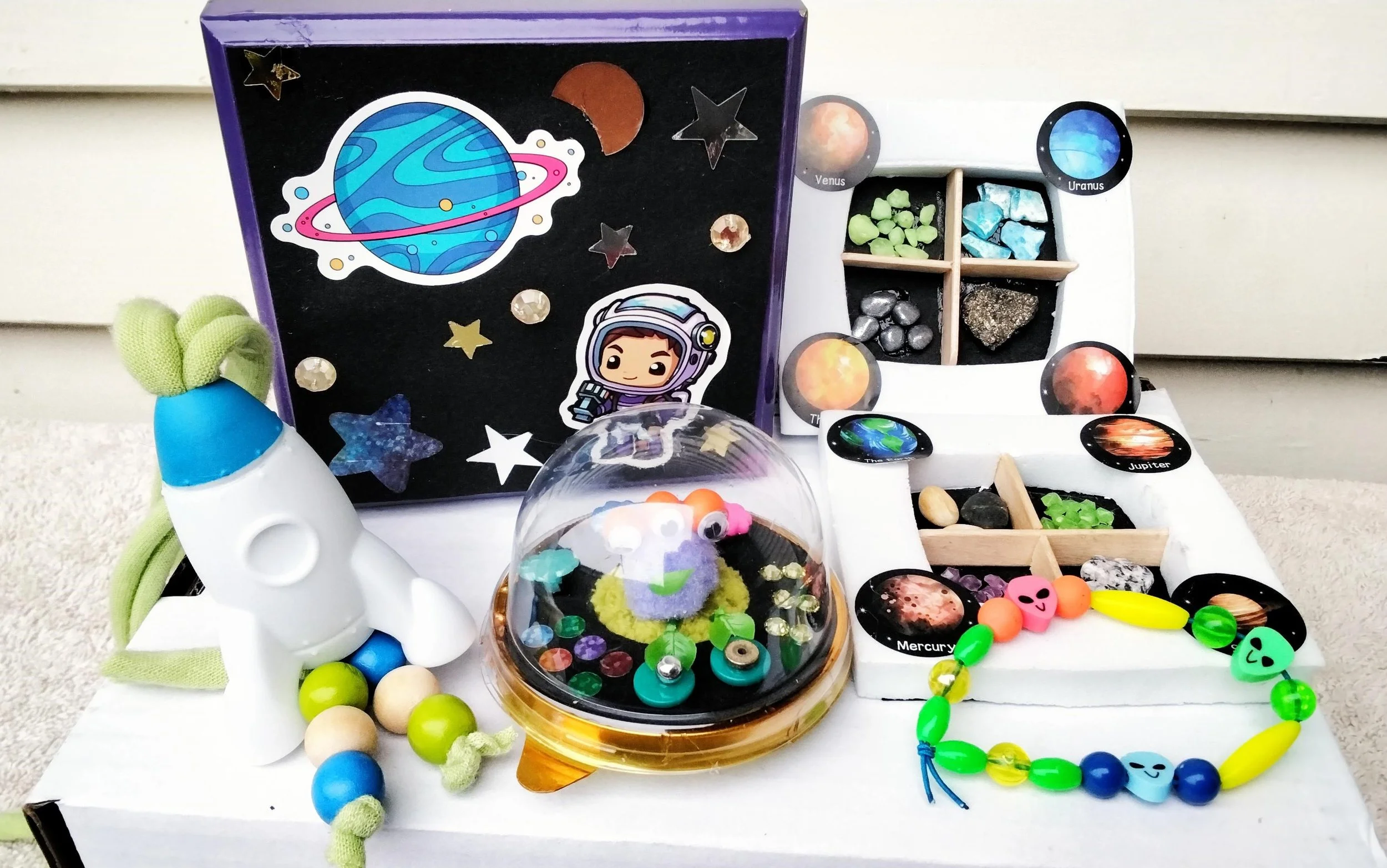 Out of this world SPACE FUN with 4 galactic creations, kids make all 4 space crafts each! 1: Space Rocks Box, 2: Miniature UFO, 3: Alien Bracelet, 4: Rocket Pendant or Bag Tag.