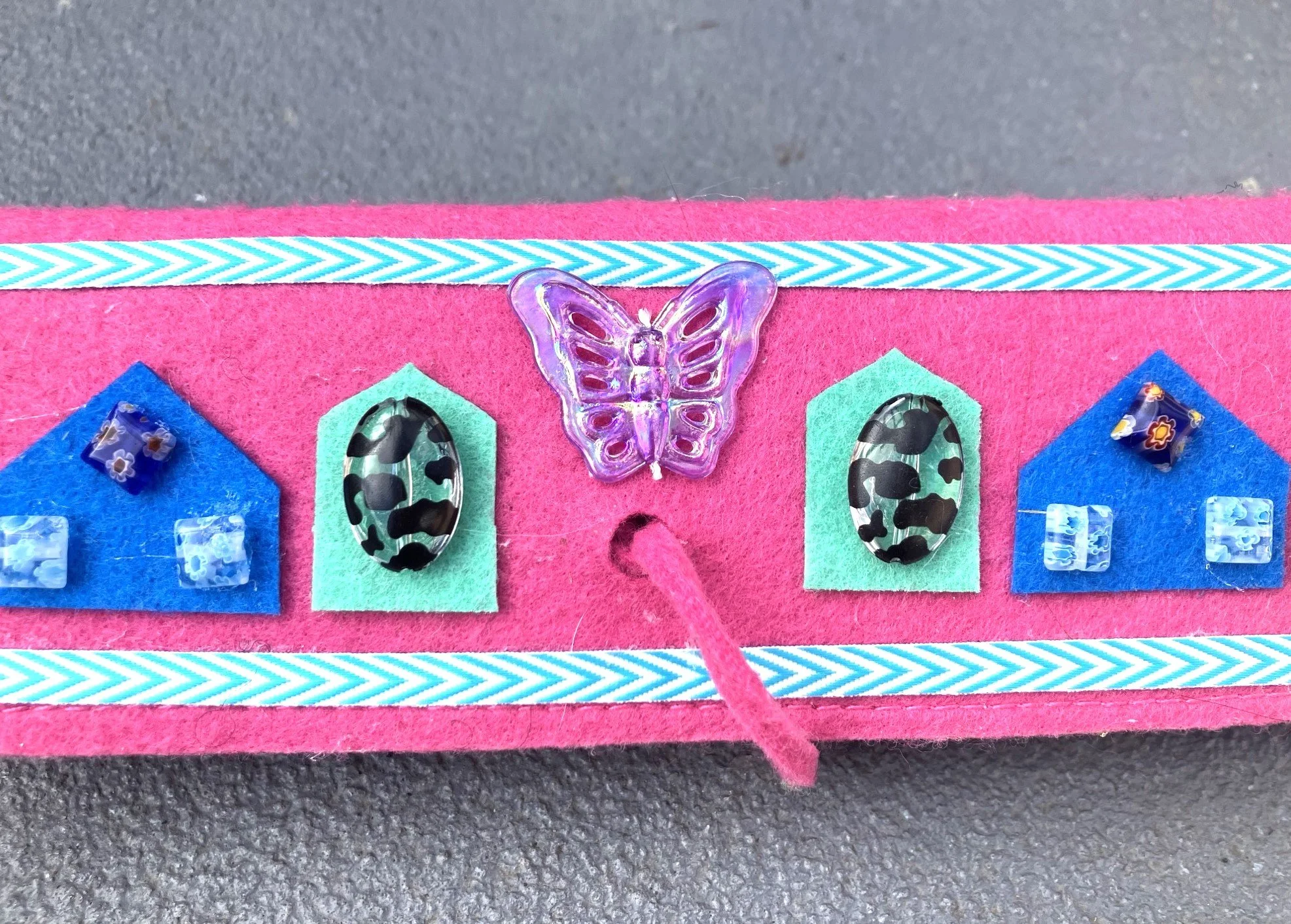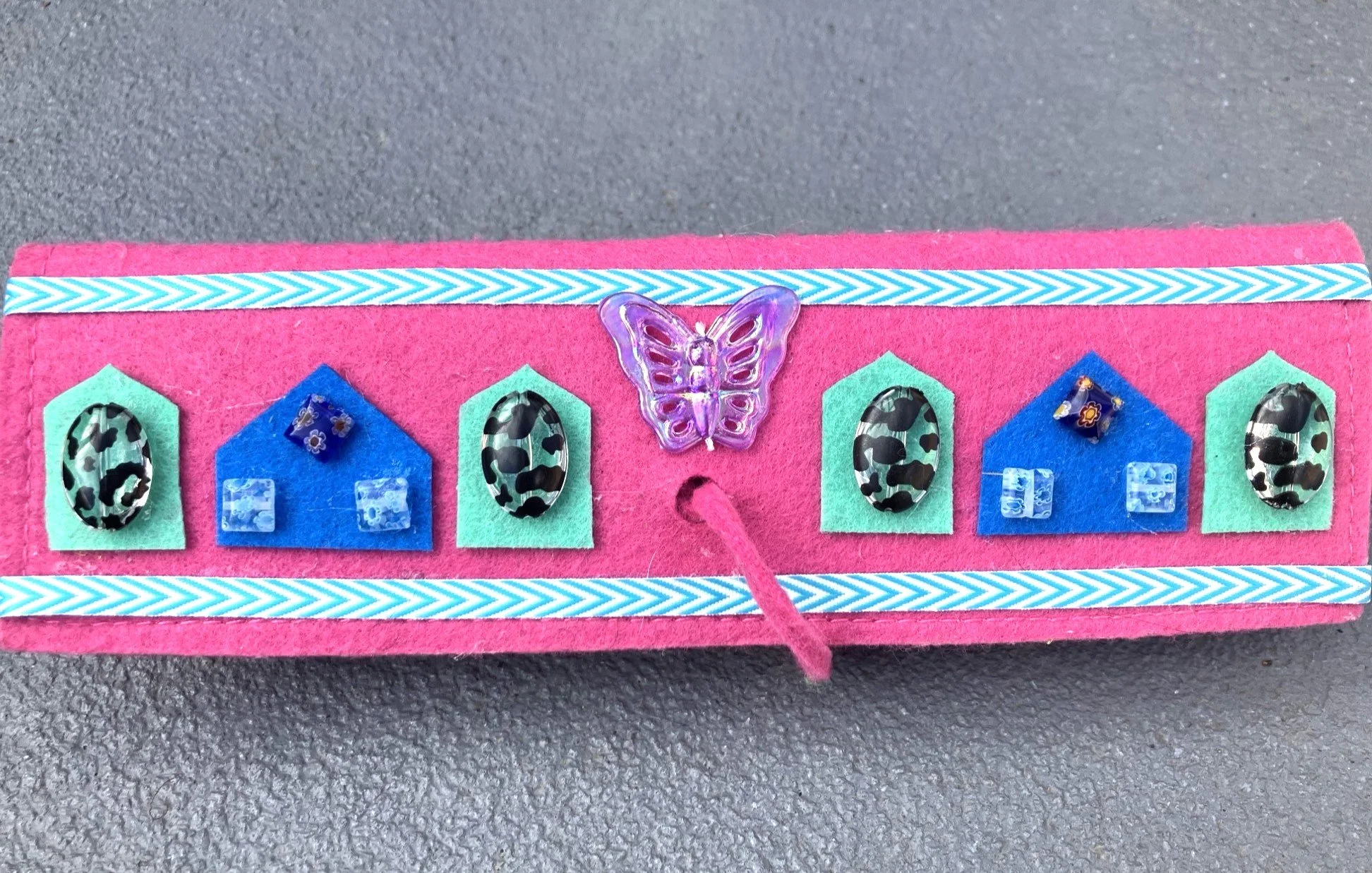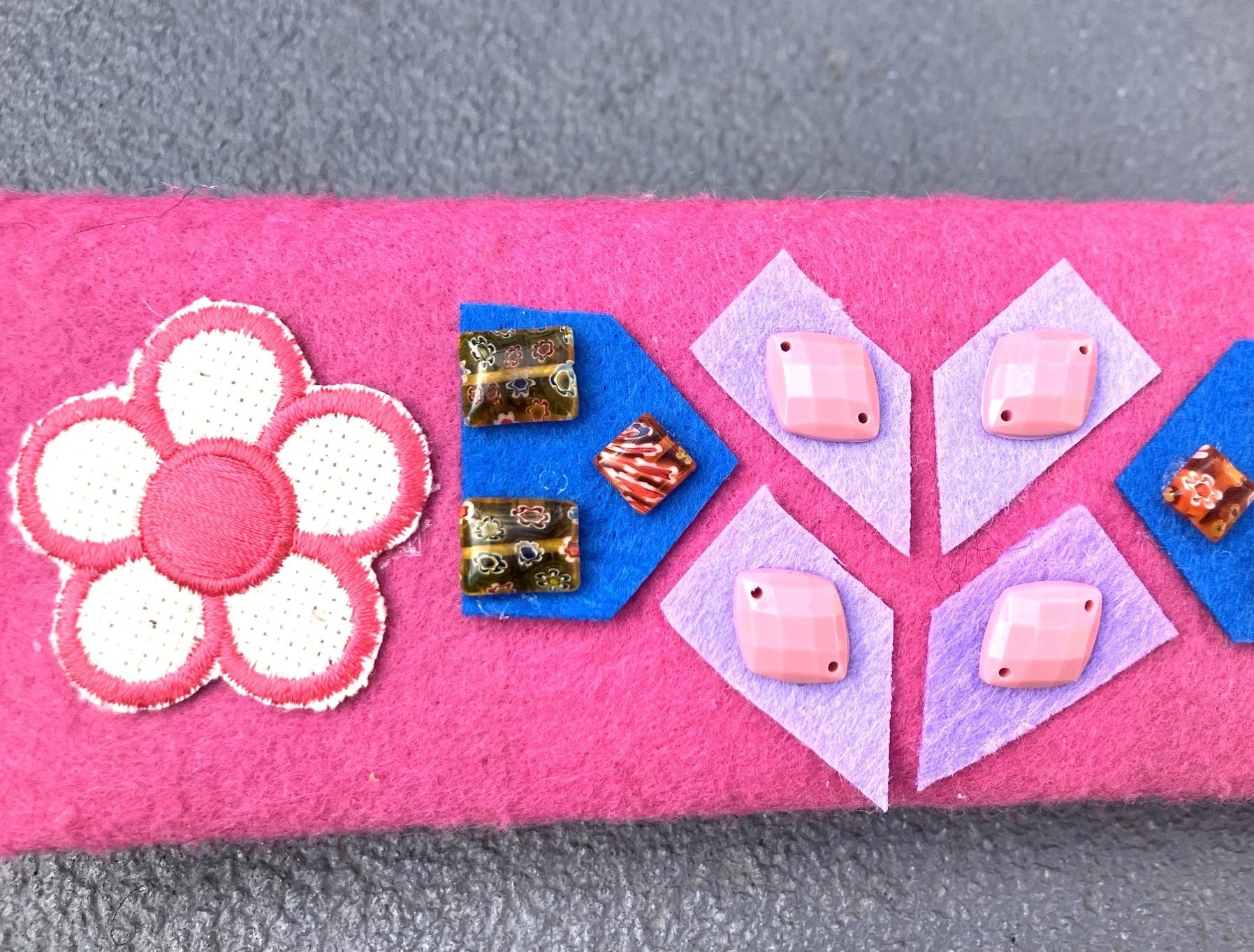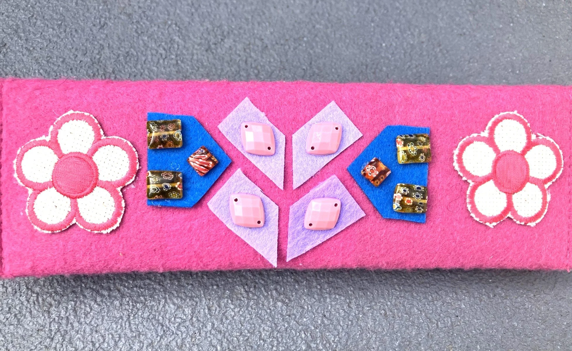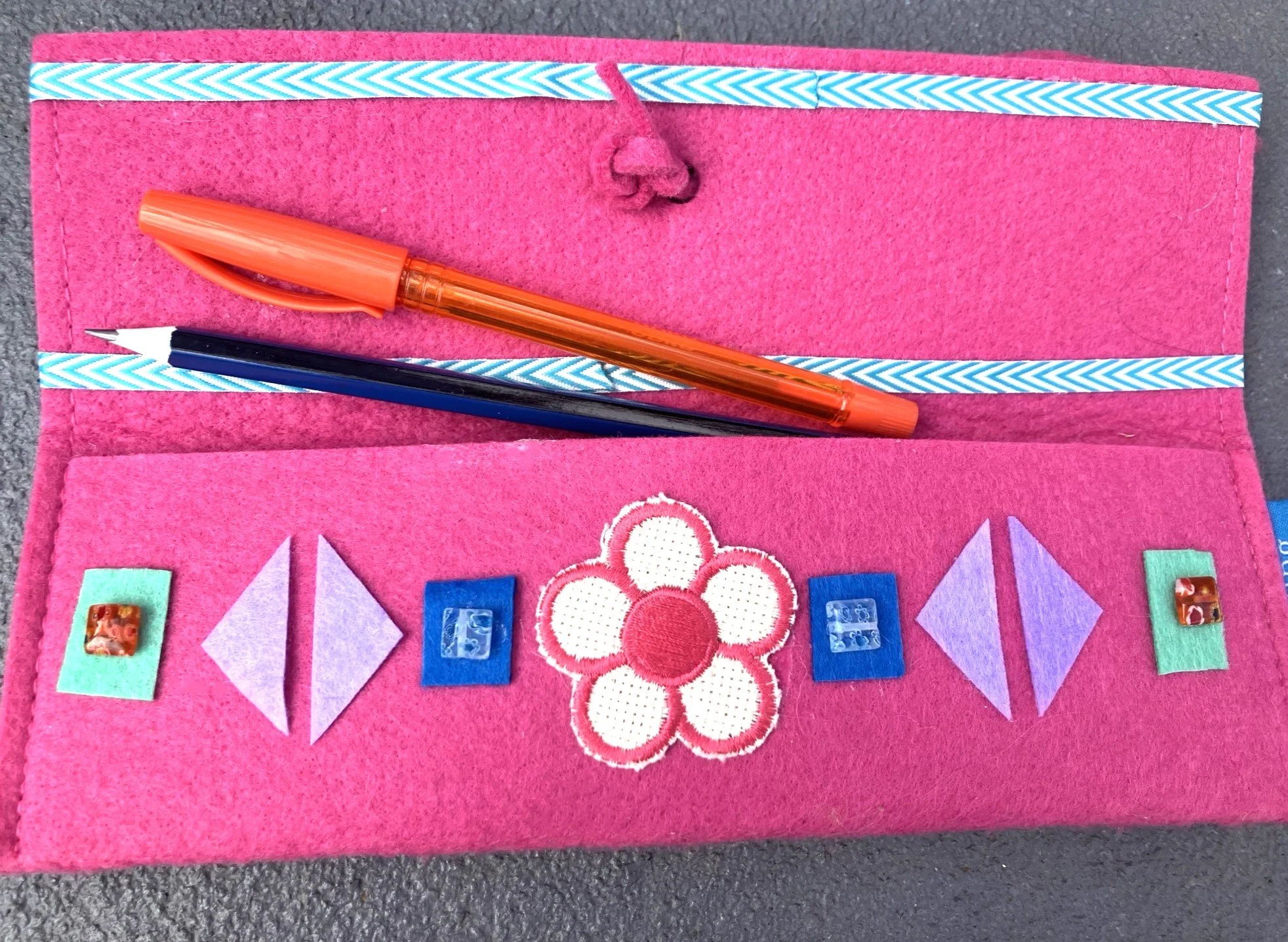 These pink felt pencilcases are ready for your fabulous designs. You are the designer; add beads, gems, sequins and coloured felt shapes to make a unique and colourful pencil case. A pen and pencil included in your pencilcase.