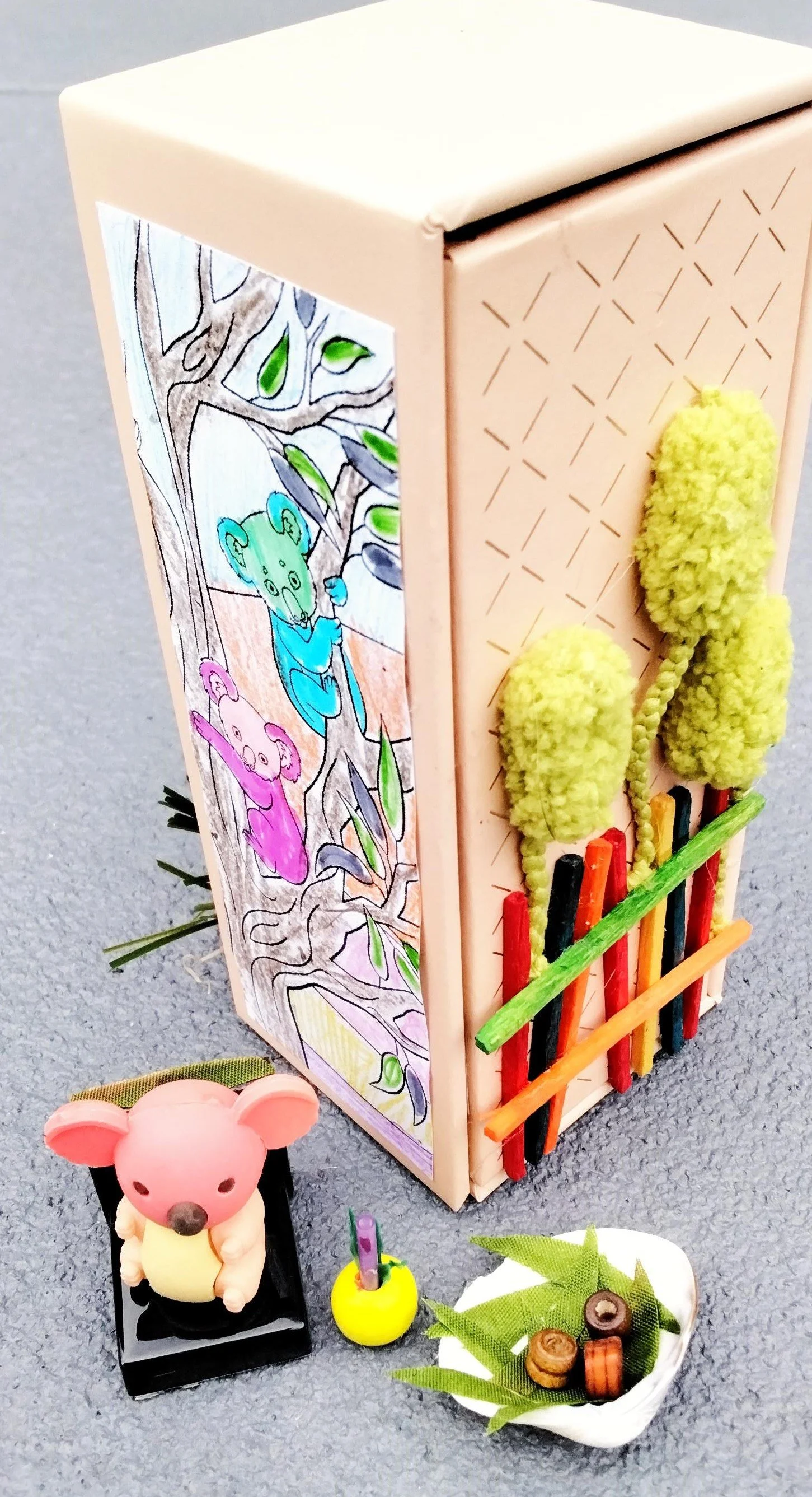 Create a Koala Kingdom scene within a wooden box, complete with koala figurine, garden and forest themed items.