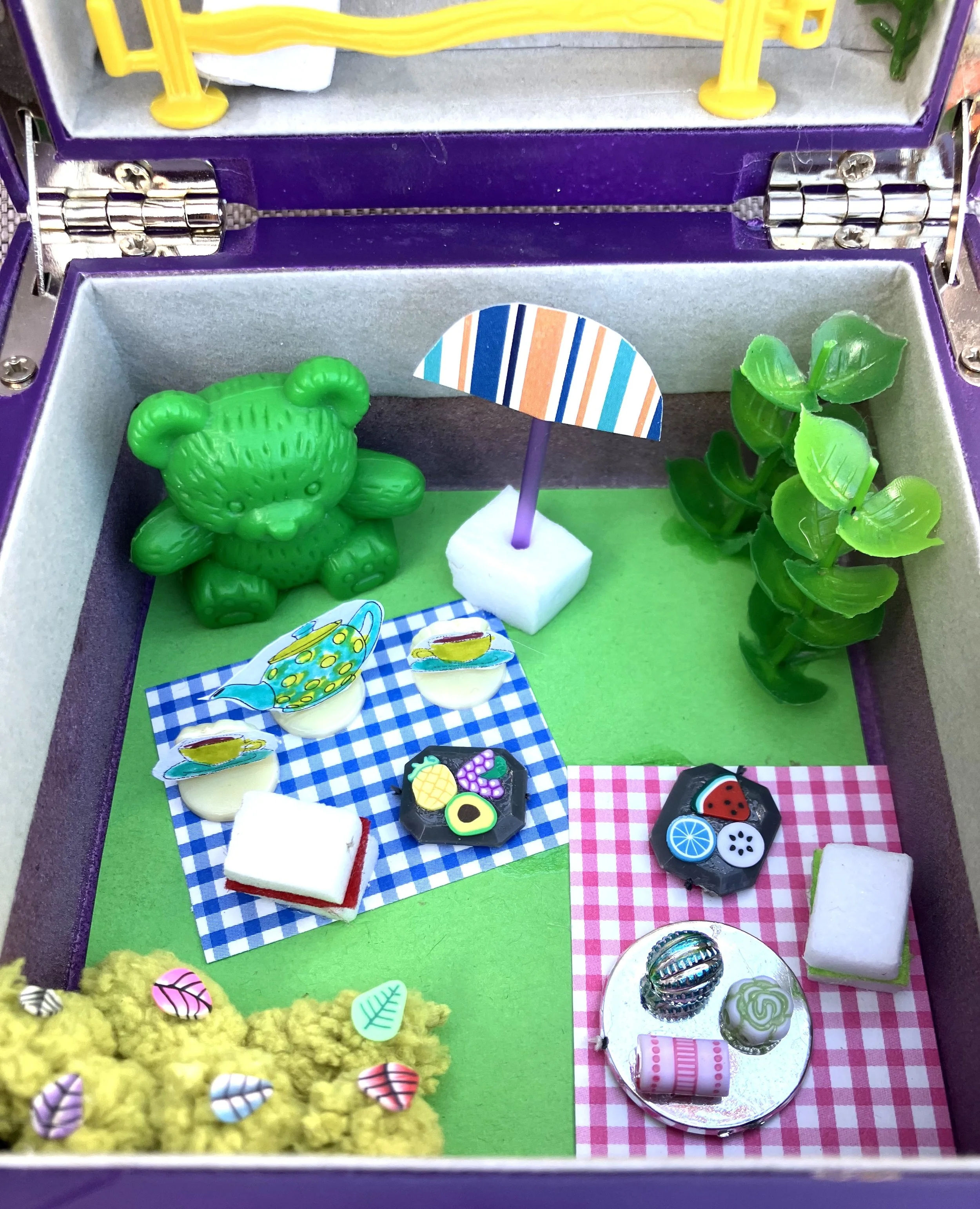 If you go down to the woods today, you’re sure of a big surprise!!!! Create a delightful teddy bears picnic scene inside a beautiful wooden box. Make picnic rugs full of food for a teddy including tiny teapot and teacups. Then add forest greenery, bees and beehive, plants and everything to make this a fabulous picnic.
